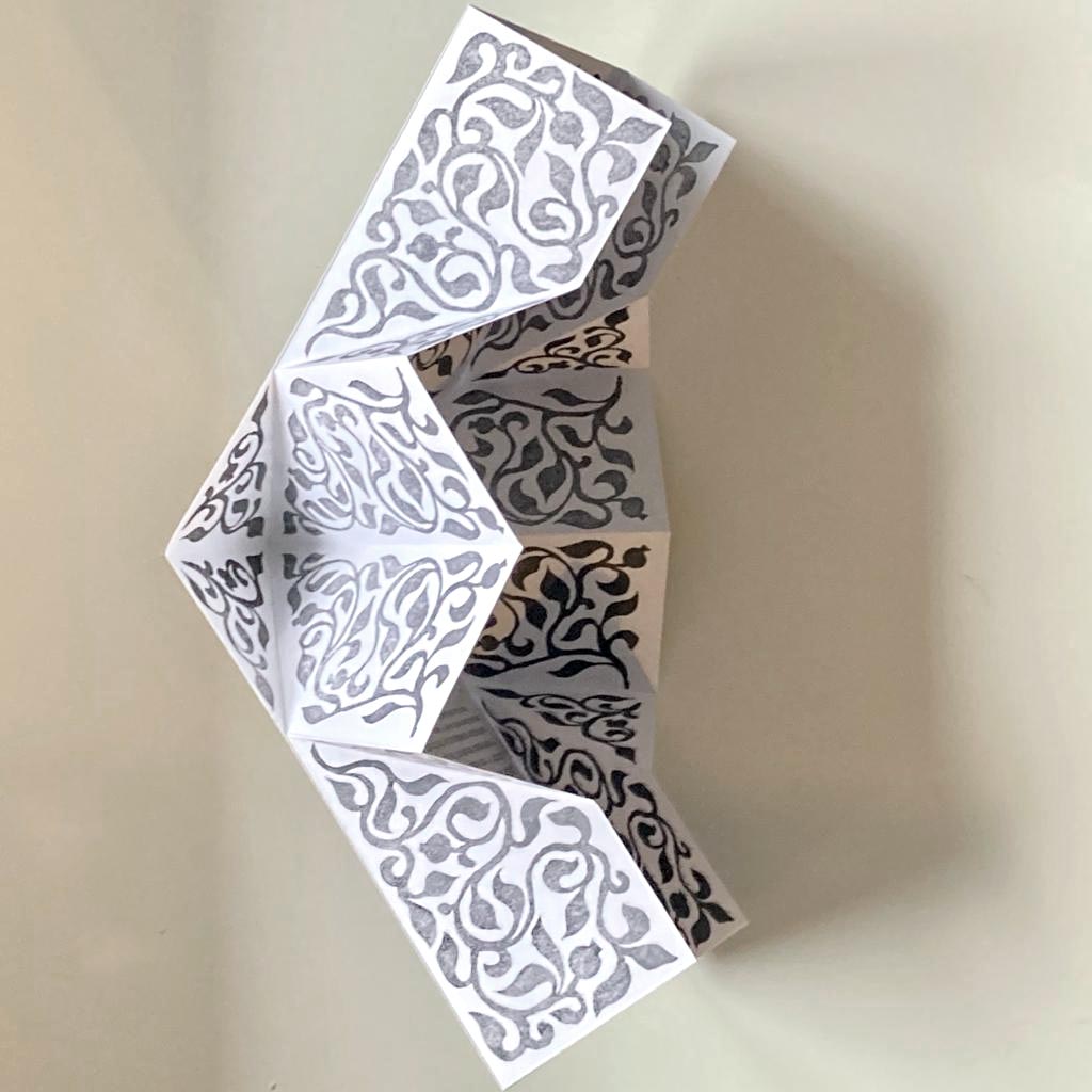 Made using hand carved rubber stamps created to fit within the folded areas of the page.