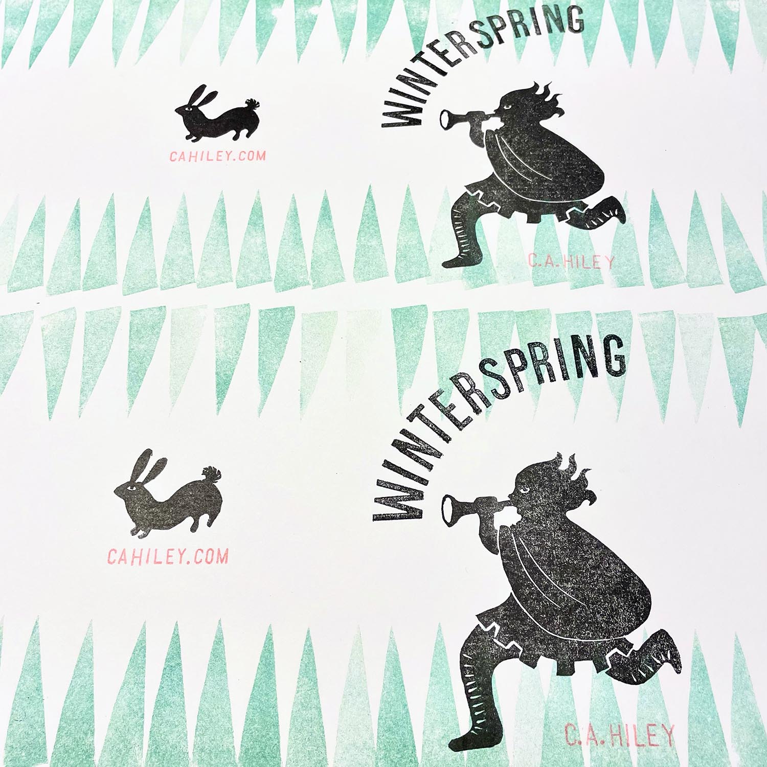 This artist book has pull-out pages illustrating the impatience of the season when it’s no longer winter but not quite yet spring. Inspired by carnival season folk traditions in Europe, I created the layers with my hand-carved stamps and a lightbox. I then used the photocopy function on the risograph machine to create the masters and print the zine in 4 colours. My reluctance to use digital technology led to the creation of two slightly different covers.